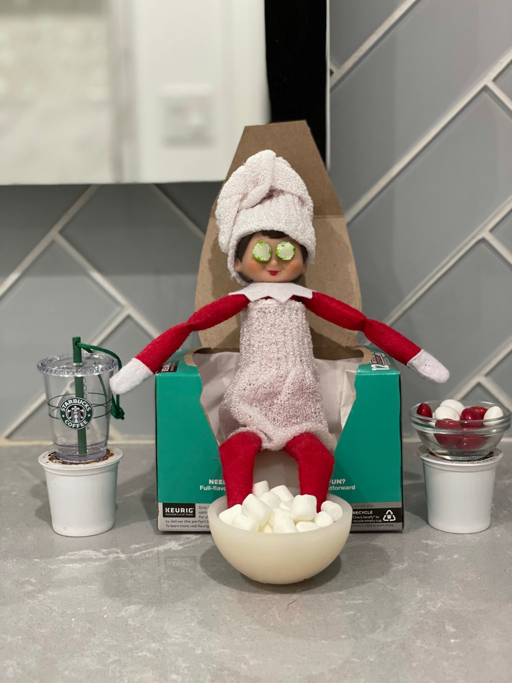 I am happy to share some tips and tricks of mine to make unique and creative Elf on the Shelf ideas that look super complicated and planned out, but really are quick and easy. (Some of these were even done the morning of.) For busy moms like me, I have to be resourceful and only utilize items that I currently have at my house. With the exception of the edible products, all the items used to put these together were pulled from old Christmas stuff I no longer use, our craft and extra/old party supplies or from items in our garage.